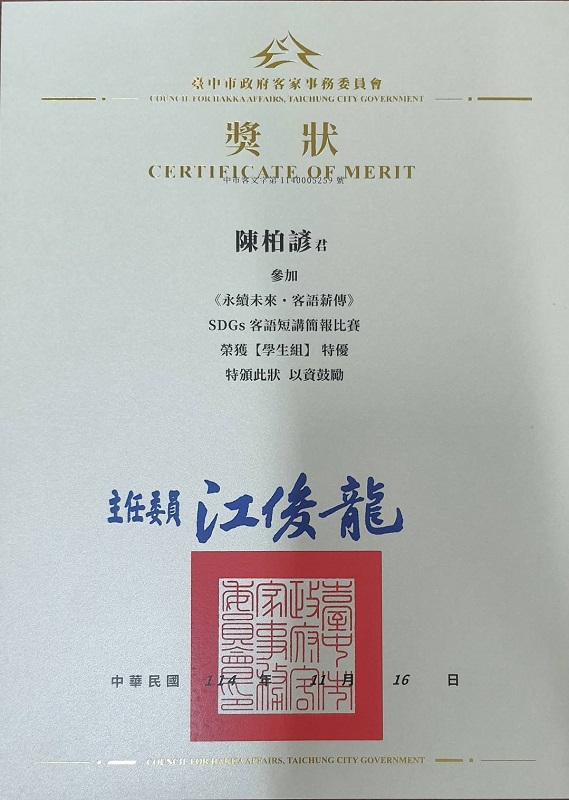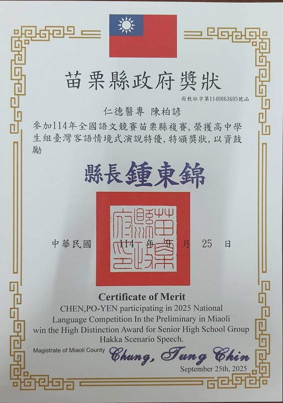 恭賀!!護理科 101 班陳柏諺同學,於競賽中表現優異,分別在苗栗縣語文競賽高中組客語情境式演說中榮獲特優,以及於臺中市「永續未來・客語薪傳 SDGs」簡報分享競賽中再獲特優殊榮,展現本校學生在語言表達、文化傳承及永續議題關懷等面向之卓越學習成果,實屬難能可貴,表現優異、全體師生同賀!